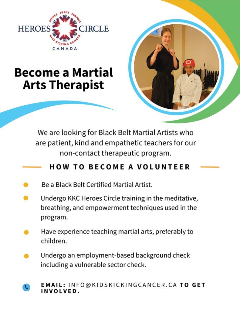 Kids Kicking Cancer is looking for new Senseis to join them and teach the kids in the Heroes Circle program to breathe in the light and breathe out the darkness.
